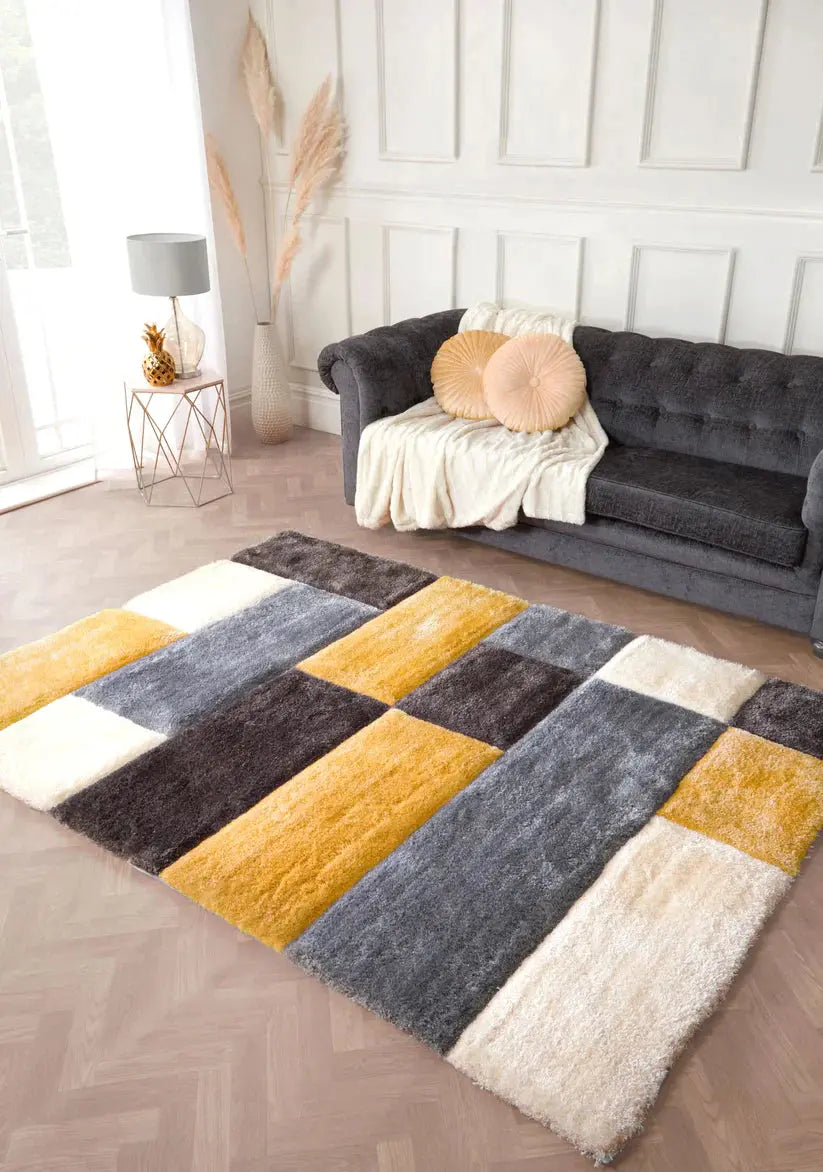 These 3D CARVED BLOCKS OCHRE rugs are made from durable materials, expertly 3D carved for a bold contemporary look, and perfect for adding a touch of elegance to any room. The raised textures create a tactile experience, offering comfort and luxury.