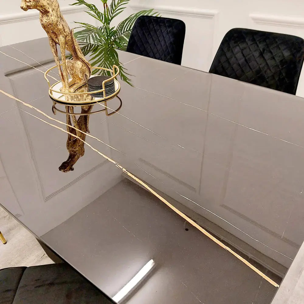Unleash the allure of the Apollo 1.6 Black Dining Table – a striking combination of style, sophistication, and modern design. Featuring a 1.6m width, 77cm height, and 87cm depth, this table is crafted with a black sintered stone top adorned with subtle mustard gold grains, adding a touch of drama and luxury to your dining space.