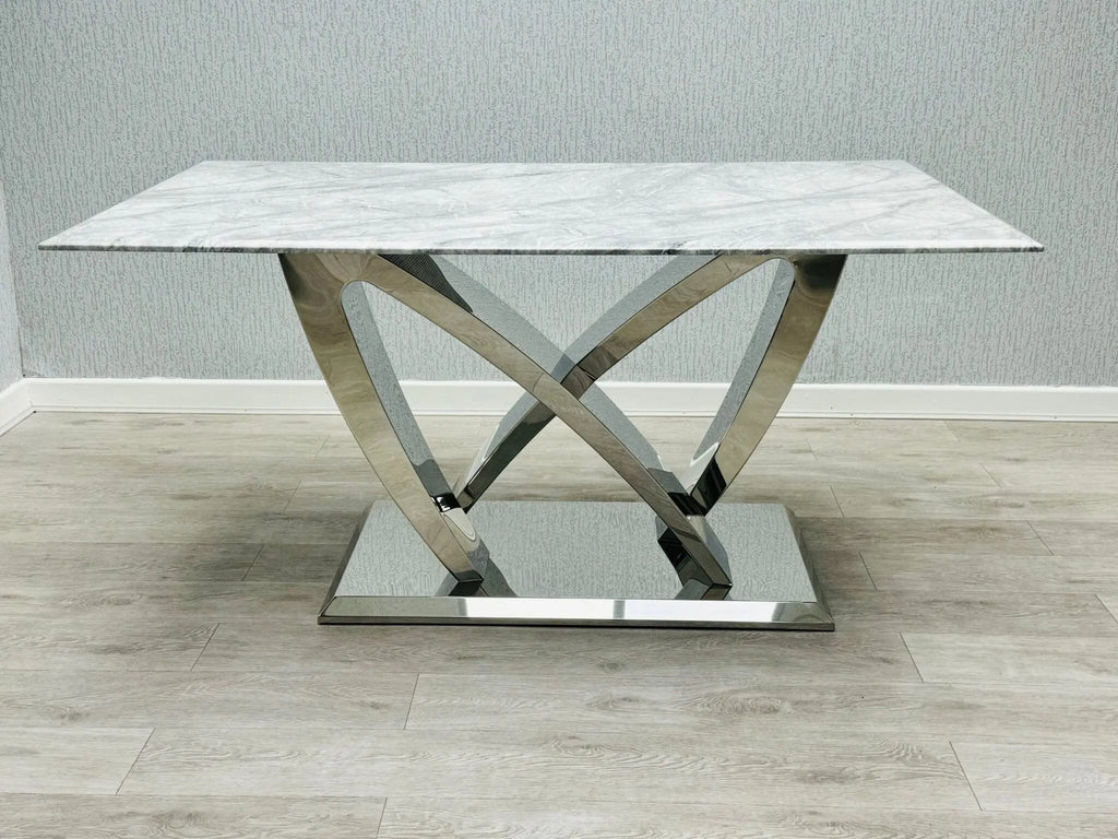 Add timeless elegance to your dining space with the California Grey Marble Dining Table. Featuring a luxurious grey marble tabletop paired with a sleek chrome/silver metal frame, this table blends classic style with modern practicality.