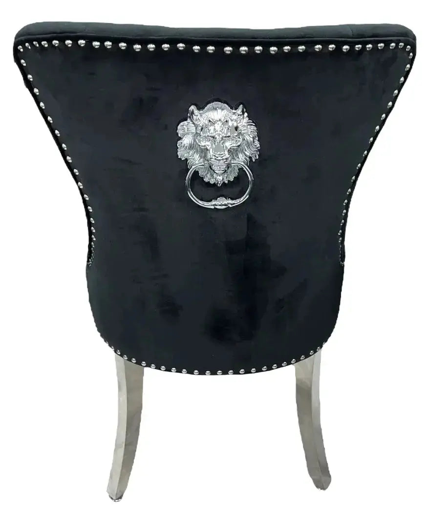 featuring sleek chrome legs and a regal chrome lion knocker, this chair is a masterpiece of sophistication.