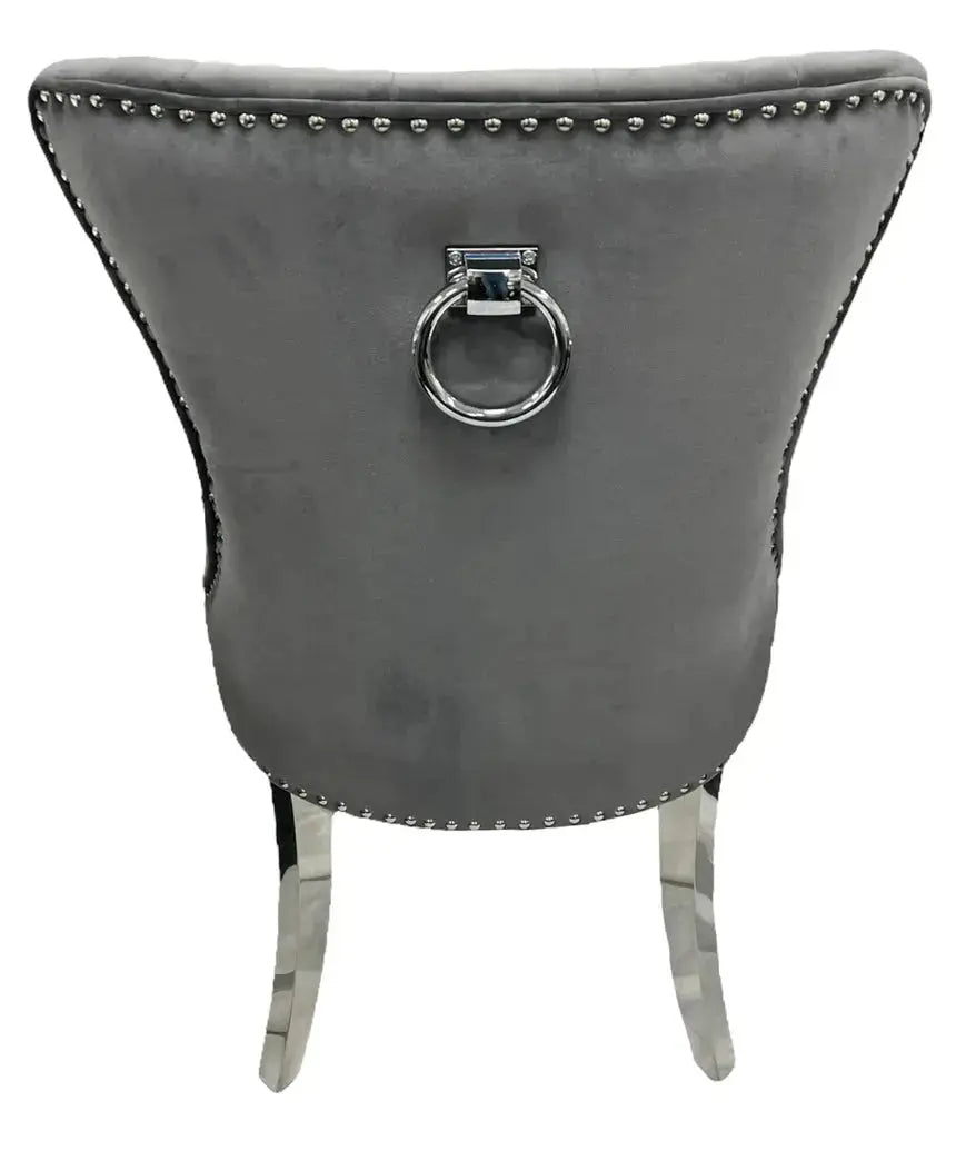 featuring sleek chrome legs and a regal ring knocker to give it the simple yet unique look, this chair is a masterpiece of sophistication.
