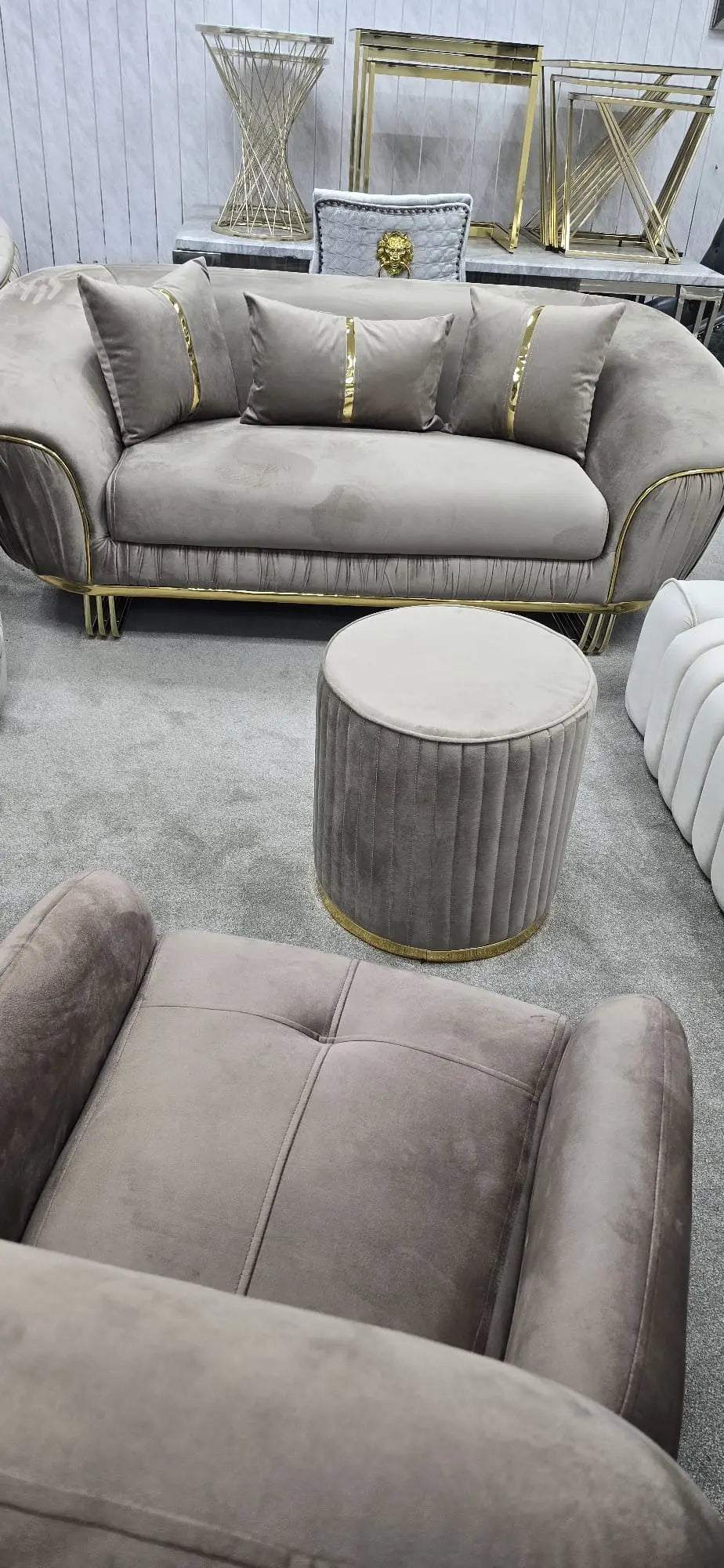 Transform your living space with the Chicago 3+2+1 Velvet Sofa Set with Footstool – a statement of timeless elegance, comfort, and luxury. This complete sofa suite includes a 3-seater, 2-seater, 1-seater, and a matching footstool, beautifully upholstered in plush beige and gold velvet tones with a rich brown and gold accent chair for a striking contrast.