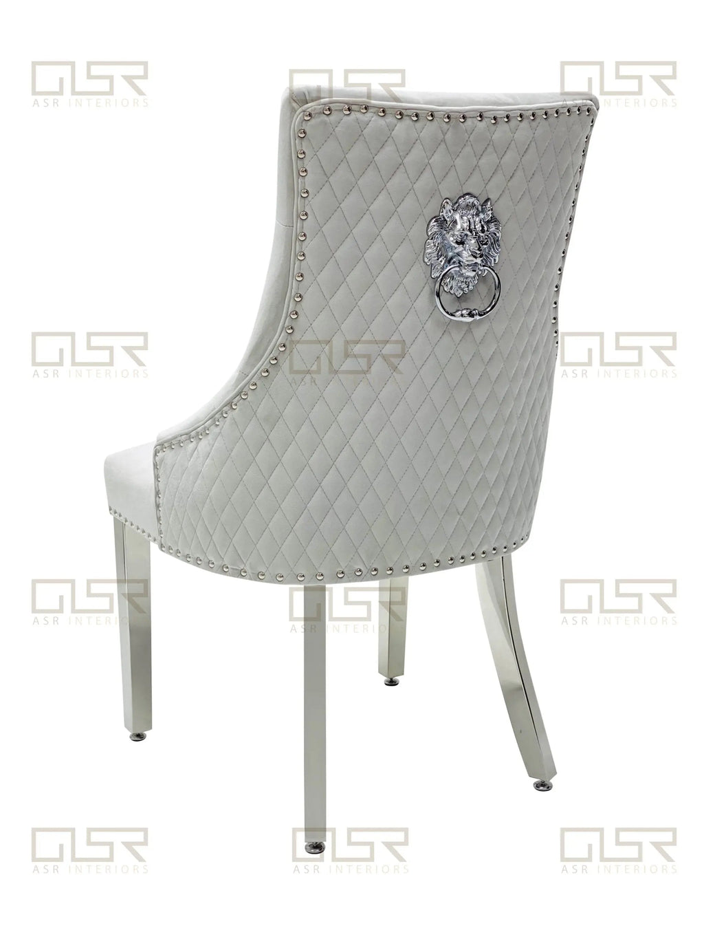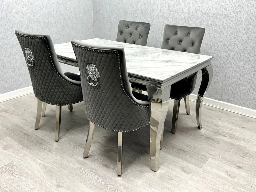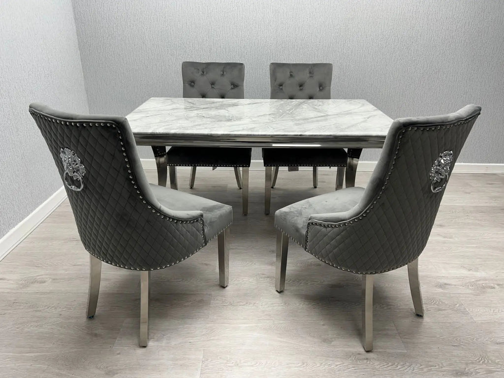 The sleek marble-effect table offers a refined silver base that reflects contemporary elegance, while the plush velvet chairs feature a regal lion knocker back — a signature of opulent dining. Together, they create a luxurious space perfect for entertaining guests or enjoying family dinners in style.