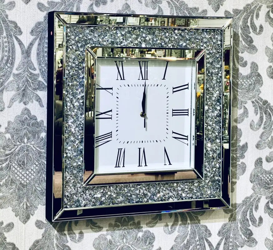 The bold square design and clear Roman numeral dial make it both elegant and practical — the perfect finishing touch for any modern or glamorous interior. Whether displayed in a living room, hallway, or bedroom, this clock brings instant sophistication to your space.
