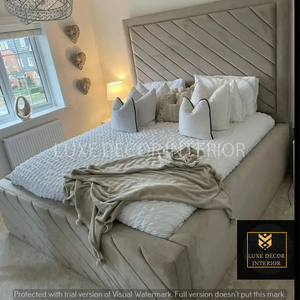 Bring elegance and comfort to your bedroom with the Duke Plush Velvet Bedstead. Handcrafted in the UK, the Duke features a diagonal lined design on the headboard and footboard, complemented by a sleek bumper bar on the headboard for a sophisticated, cushioned look.