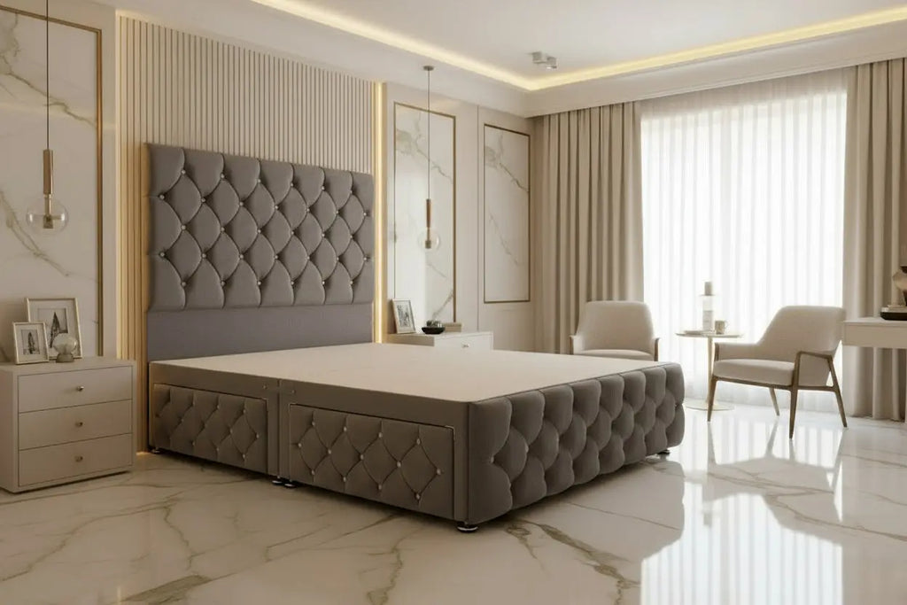 The Eleana Divan Bed is the definition of modern elegance and functionality. Expertly handcrafted in the UK using premium timber and luxurious plush velvet, this bespoke bedframe combines timeless design with everyday practicality.