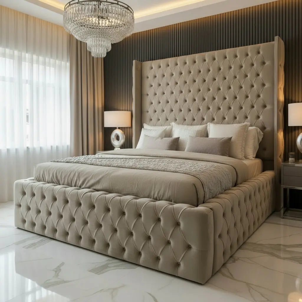 Discover timeless craftsmanship and luxury with the Kalahari Chesterfield Bed in Plush Velvet. This beautifully upholstered bed frame combines the traditional charm of deep button detailing with modern elegance, creating a bold statement piece for any bedroom.