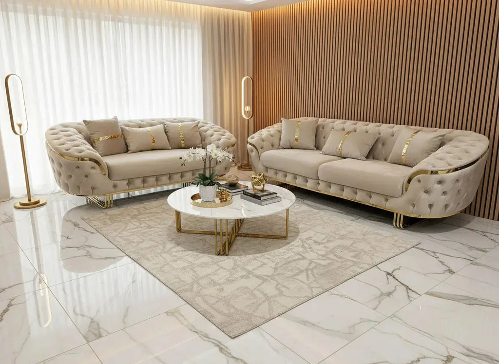 The Kingston 3+2 Sofa Set in Champagne Velvet brings together luxury, comfort, and statement design like no other. Its radiant gold detailing and plush velvet upholstery transform any space into a showcase of modern opulence — proof that comfort and glamour can coexist beautifully.