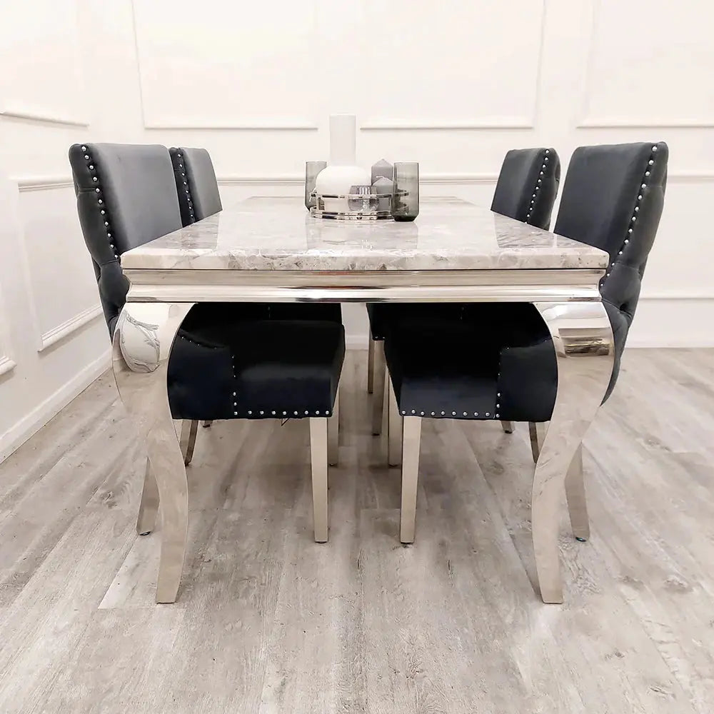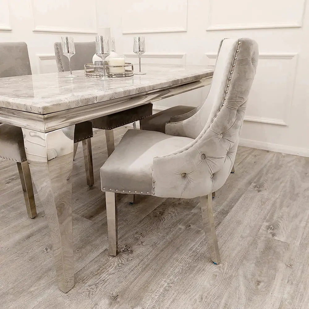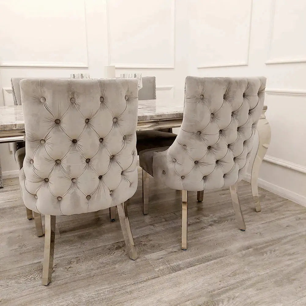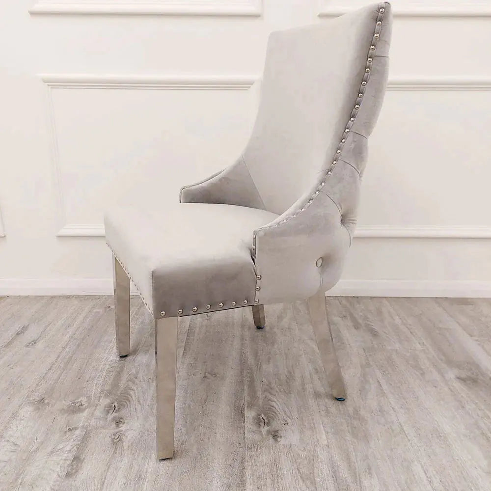 Our Kensington Velvet Dining Chair features Chrome stud detailing, our signature Chrome legs and a super luxurious deep buttoned back.