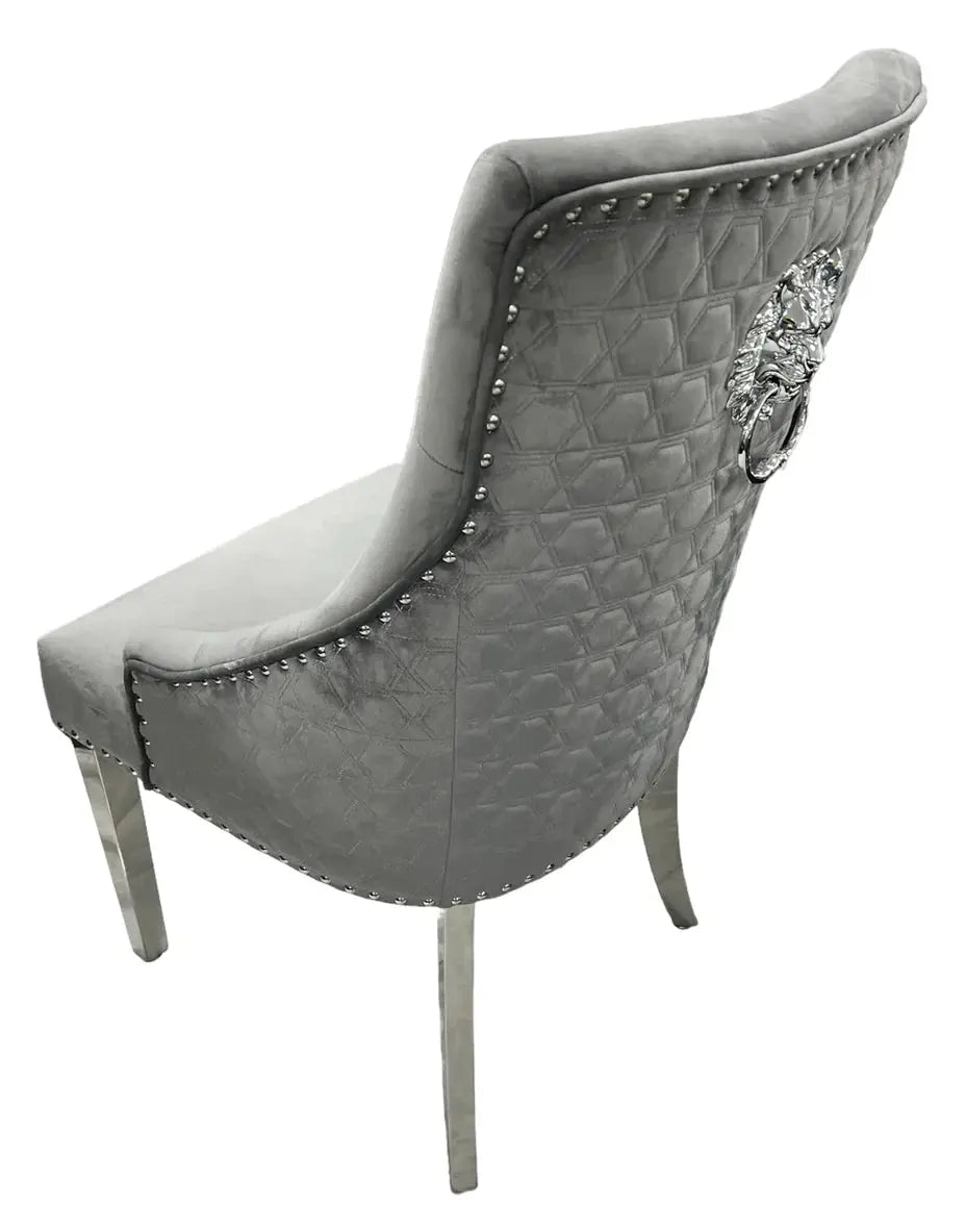 Our newly redesigned Lexi Exclusive upholstered scoop back dining chairs are sophisticated and very elegant. A lovely luxury model that's designed to impress anyone who steps foot into your dining room. The checkered back velvet plus the detailing with decorative chrome steel studs and a elegant chrome steel lion knocker and are complete with four stainless steel legs