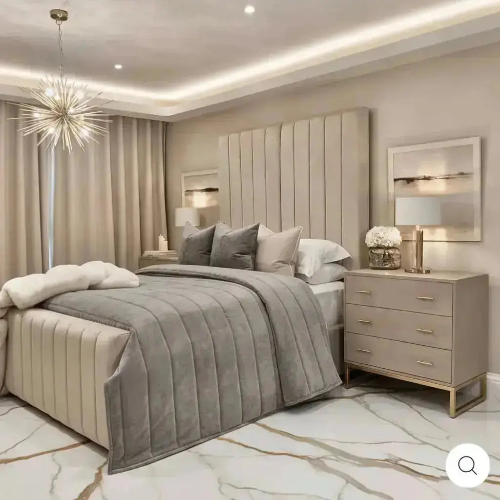 Styled in a neutral plush velvet finish, the Louisiana Bed adds warmth and luxury to any bedroom. Pair it with gold-accented lighting, soft layered bedding, and matching bedside drawers for a timeless, hotel-inspired feel.