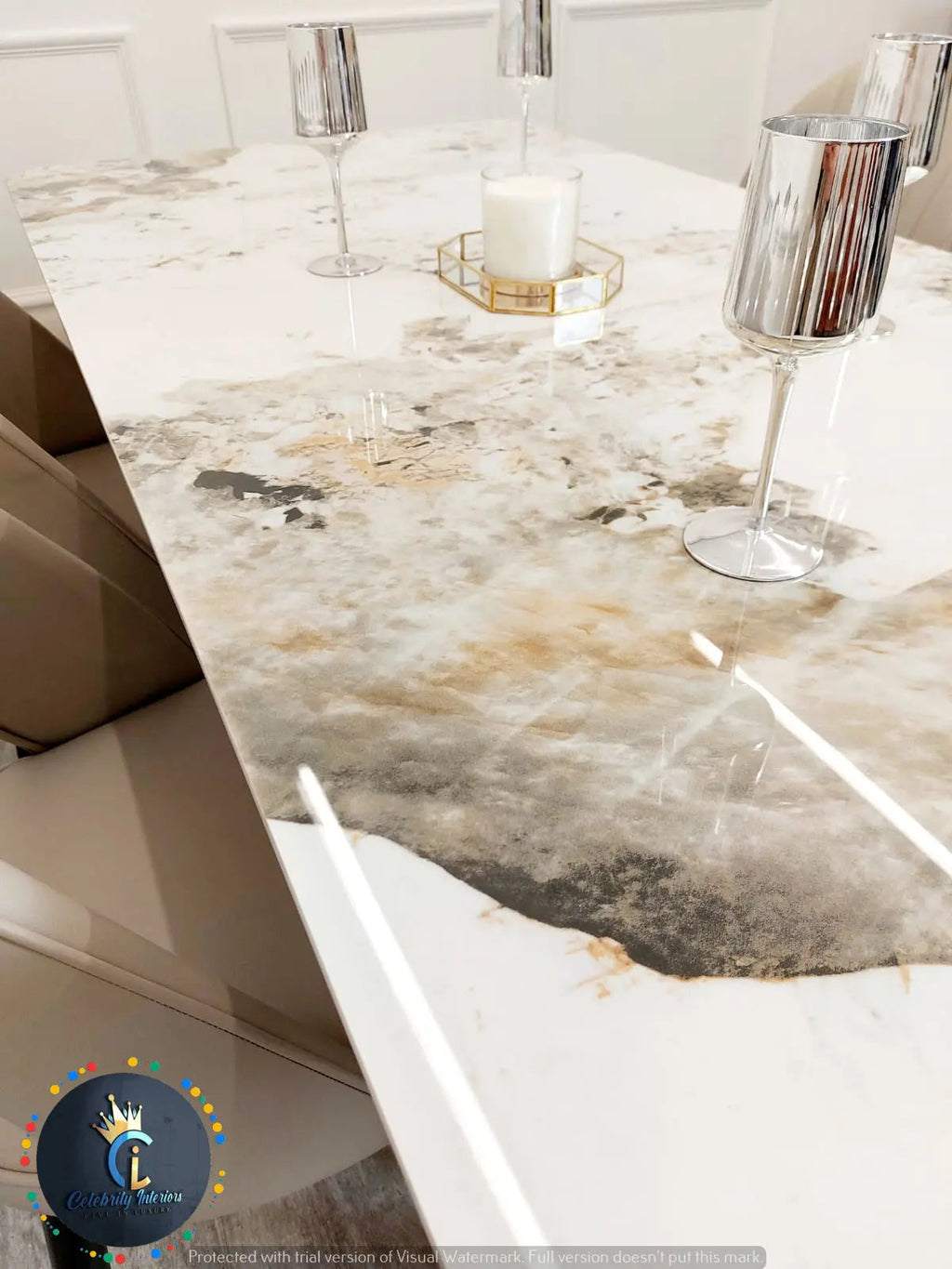 The Lucien 1.8m Pandora Gold Sintered Stone Top and Astra Leather Chairs offer a refined and contemporary addition to any dining space. Featuring a distinct manufactured look and feel, this exquisite dining table is a statement of excellence. Its stainless steel base provides stability and a unique, retro design that can accommodate 4-6 people. The smooth surface is easy to clean and the curved edges add a touch of safety for children. The Astra chairs pair perfectly with this table, offering ergonomically designed back support and a faux leather upholstery that is both stylish and easy to clean. Upgrade your kitchen, dining hall, restaurant, or hotel with this elegant and functional set.