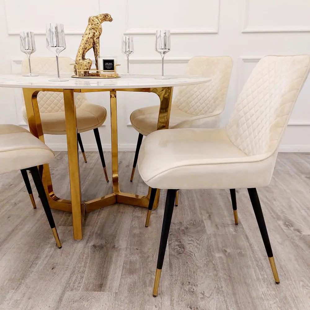 The Lucien Gold 1.2 Round Dining Table is an ideal choice for any dining area. Crafted with a durable sintered stone top and a gold-plated metal frame, this stylish yet sturdy table will provide years of reliable use. Its round design ensures everyone has an equal view of the conversation, making it perfect for intimate meals and entertaining.