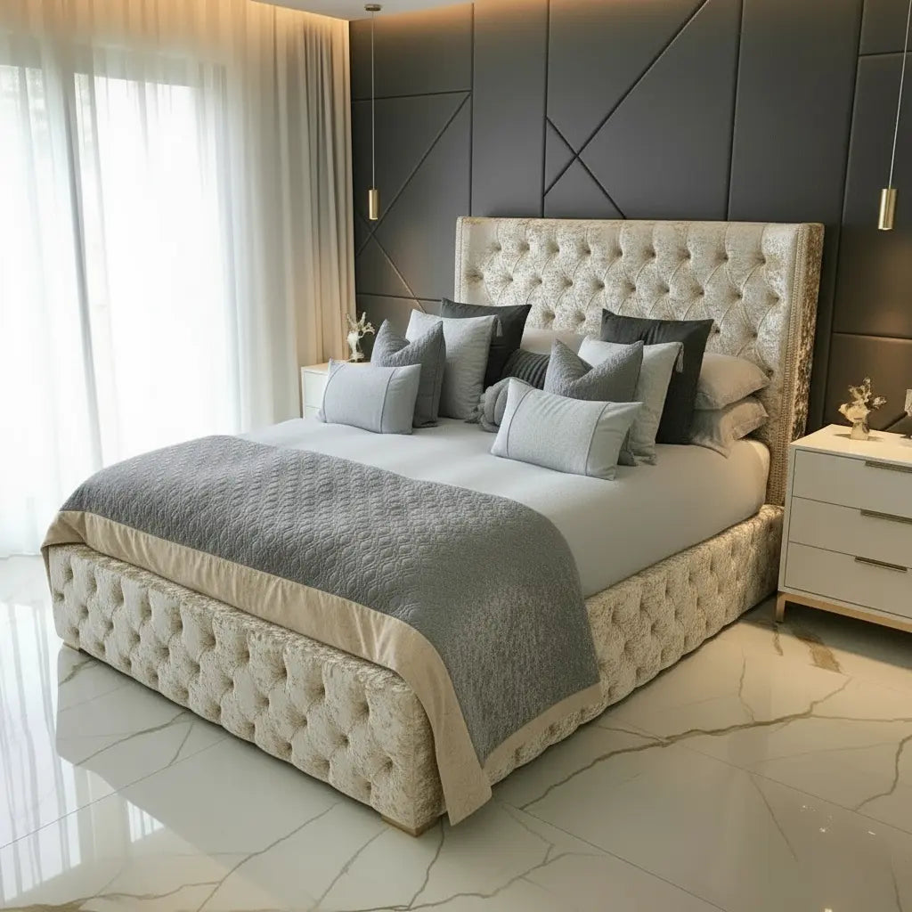 ✔ Wingback Crushed Velvet Headboard & Footboard – Tall, curved design with diamond buttoned or diamante detailing.