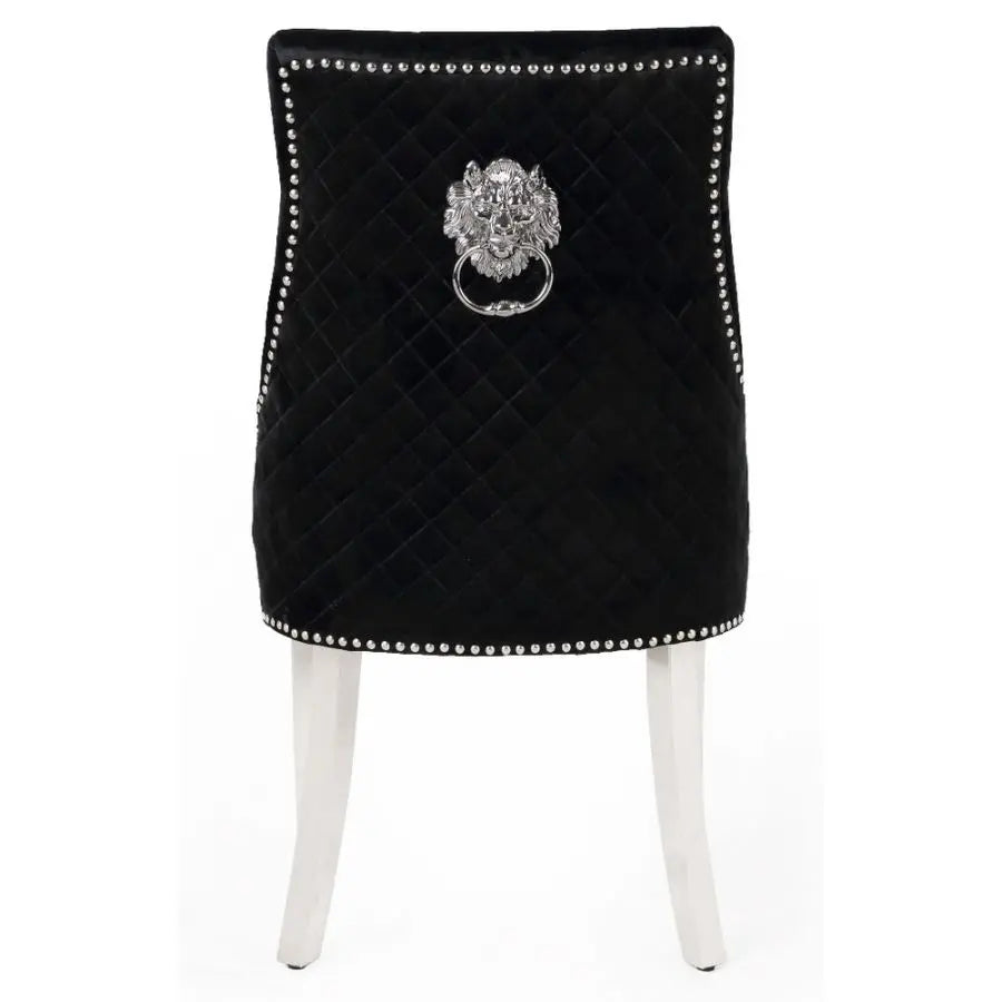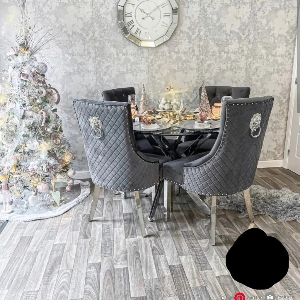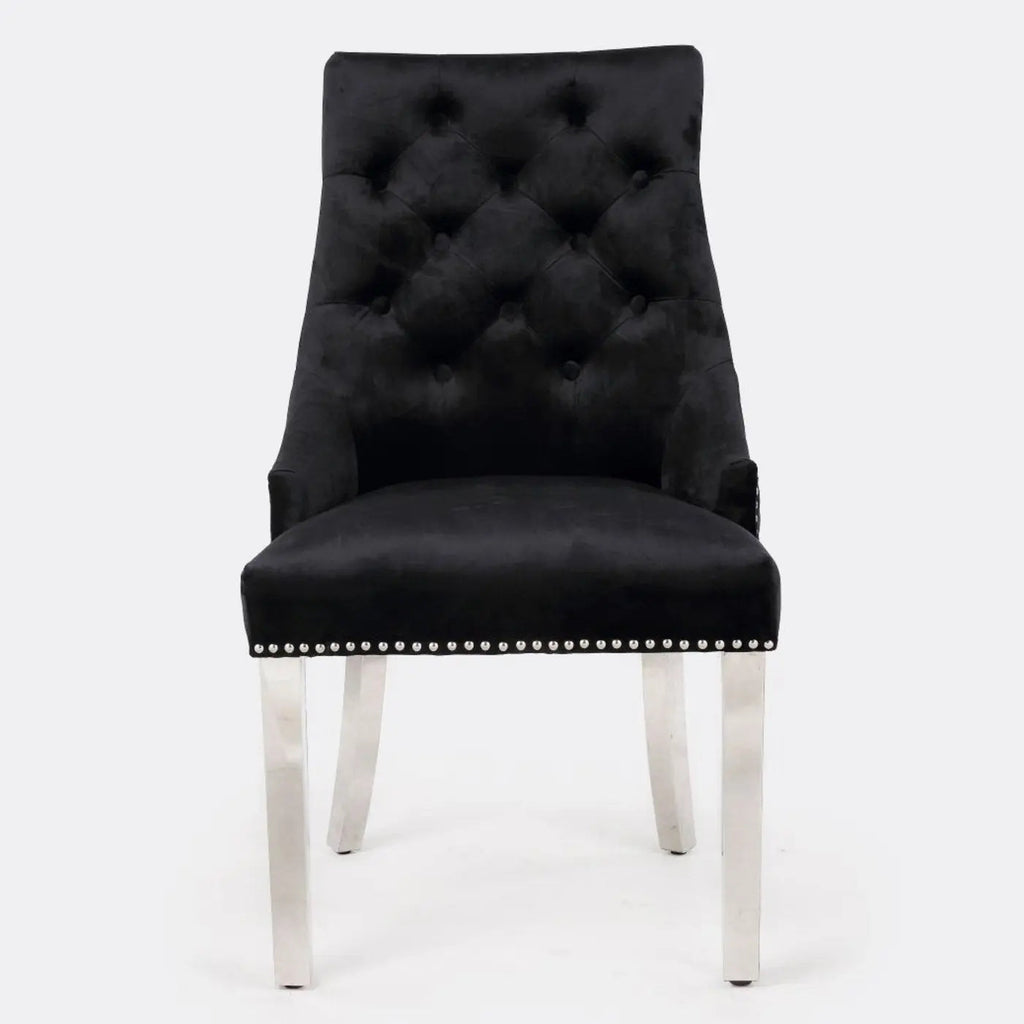 Our newly redesigned Majestic Exclusive upholstered scoop back dining chairs are sophisticated and very elegant. A lovely luxury model that's designed to impress anyone who steps foot into your dining room. The backrest boasts a quilted button detailing with decorative shiny steel studs and a elegant shiny steel ring and are complete with four stainless steel legs.
