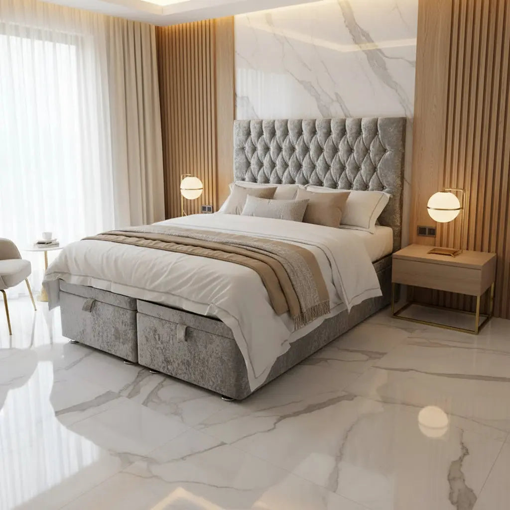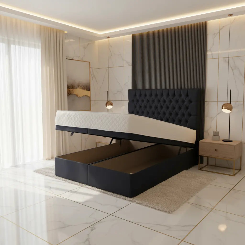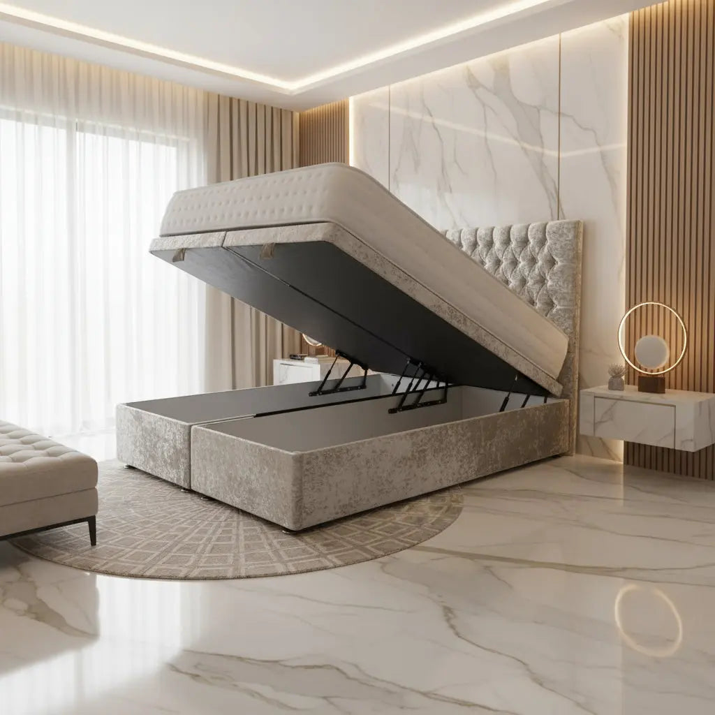 The Monte Carlo Gaslift Ottoman Bed brings modern elegance and practical storage together in one stunning statement piece. Featuring a 54-inch tall cubed headboard, deep upholstery, and smooth silver gliders, this handcrafted bed offers both luxury and everyday functionality.