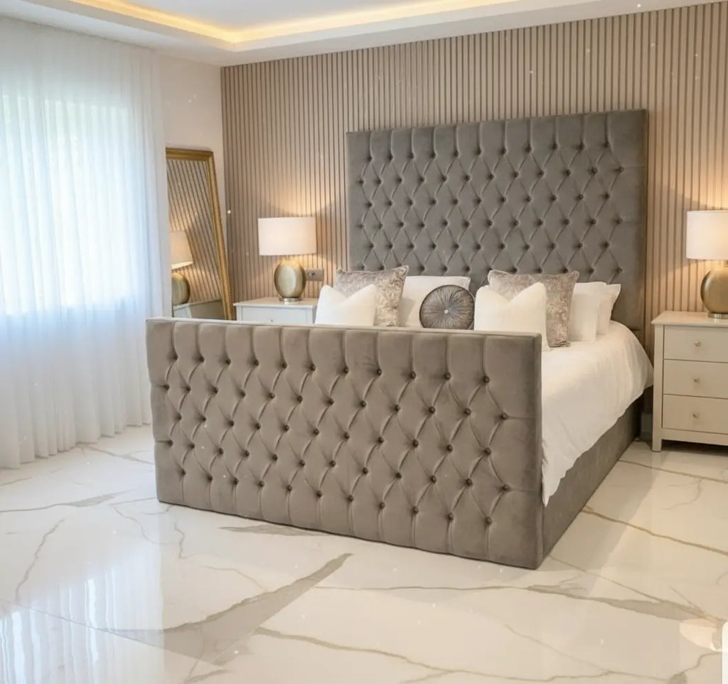 Featuring an impressive 65-inch tall headboard and a 45-inch footboard, the Phantom exudes grandeur from every angle. The beautifully upholstered panels and smooth plush velvet finish make it the perfect fusion of style and sophistication. Whether you opt for elegant fabric buttons or sparkling diamantes, this bed is crafted to impress.
