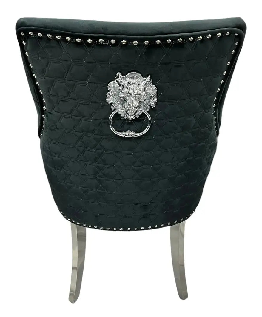 Imagine the sleek embrace of Chrome legs, a fierce chrome lion knocker at the back- its not just a chair; its a symphony of elegance and excitement!