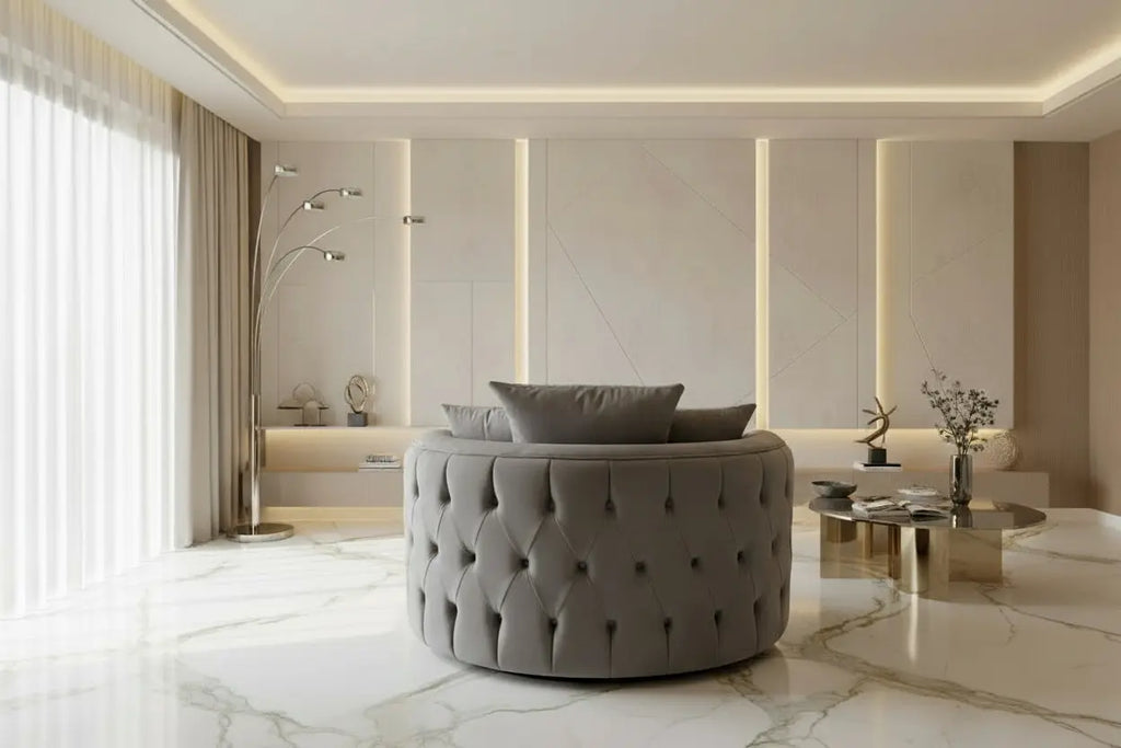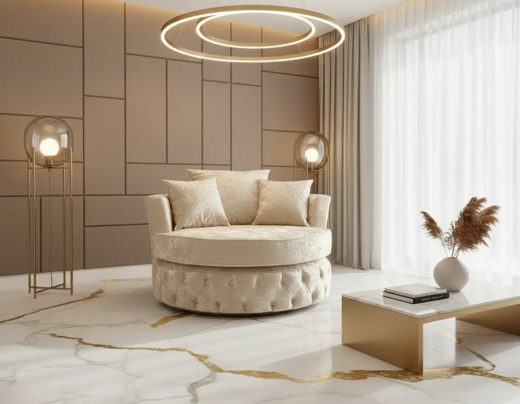 The Swivel & Upholstered Cuddle Chair combines handcrafted quality, modern design, and unparalleled comfort — a luxurious centrepiece for any contemporary living space.