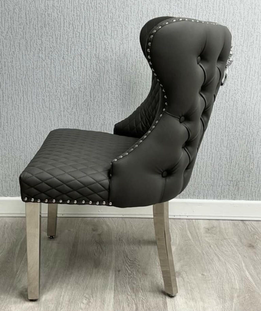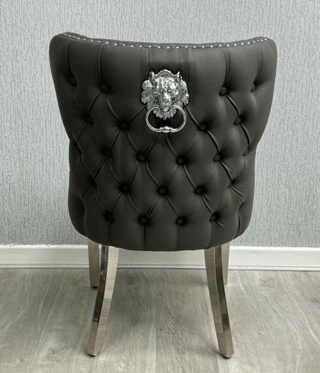 Valentino Dining Chair – Grey Leather with Lion Knocker
