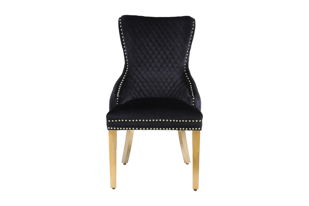 The standout feature is its shiny gold lion head knocker, symbolising strength and style, complemented by elegant gold stud detailing around the edges. A padded seat and supportive high back ensure both comfort and class at every meal, making it ideal for both modern and traditional interiors.